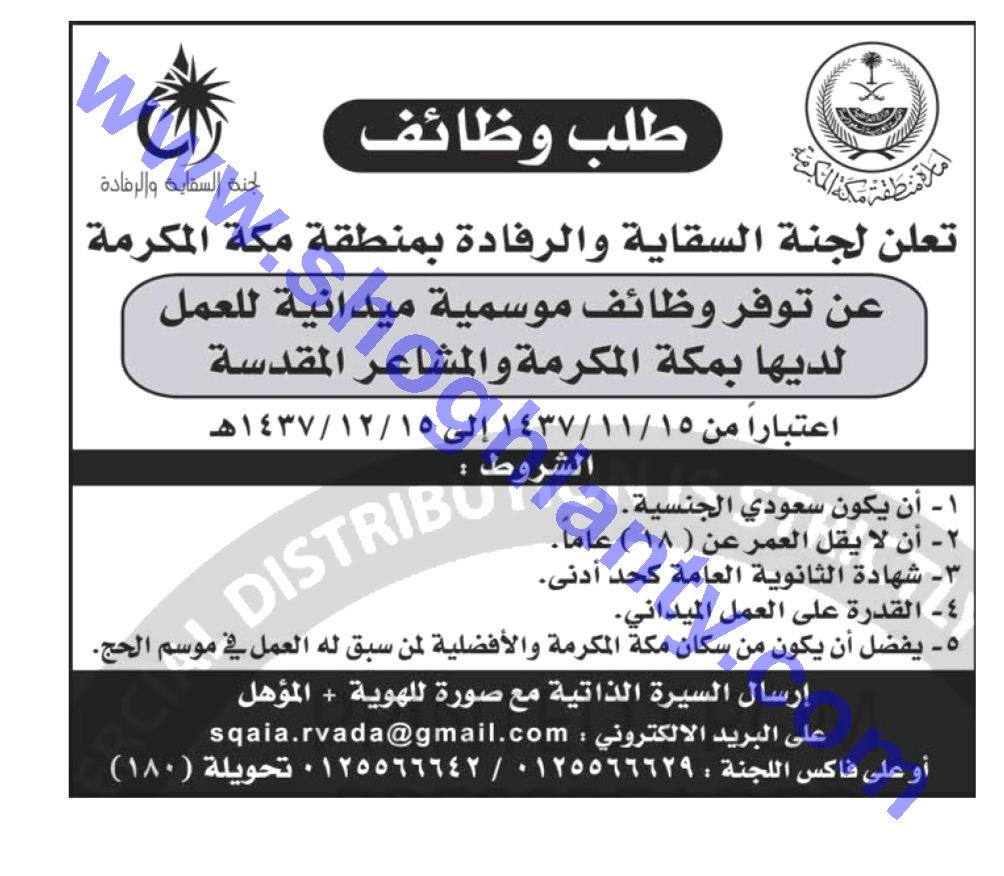وظائف موسمية في مكة 1437هـ لجنة السقاية والرفادة